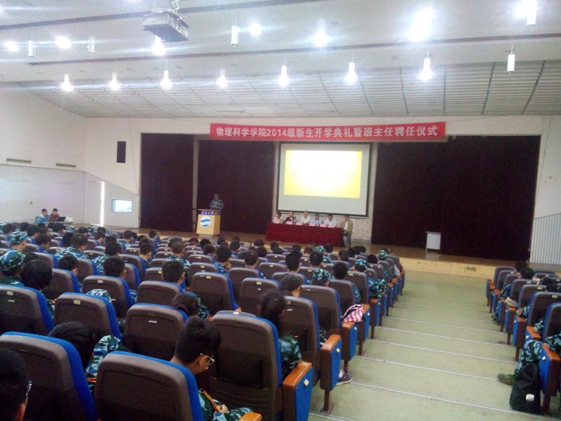 开学典礼由学院党委副书记牟晓燕主持,她代表学院对新生表示热烈欢迎和衷心祝贺。基础物理教学中心主任何丽珠代表学院教师致辞,她鼓励新生满怀热情、坚定信念学好专业知识,做一名可以创造机会的强者。2011级学生刘宇婧代表老生发言,她结合自身经历从知识、社交、实践三方面讲述了个人对大学生活的认识,并建议新生加强和同学、老师的交流,在他人的建议中进行自我修正。2014级学生秦志豪代表新生发言,他表示会快速地融入大学生活,学会包容,持之以恒,努力实践,不做懦弱的退缩。