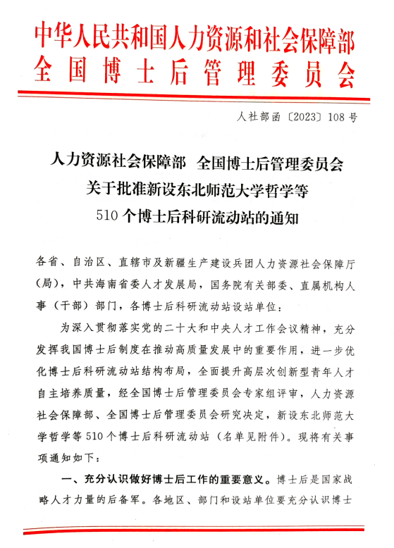 近日,人力资源和社会保障部、全国博士后管委会联合下发《关于批准新设东北师范大学哲学等510个博士后科研流动站的通知》,物理学博士后科研流动站成功获批,这是2023年我校唯一获批的博士后科研流动站。