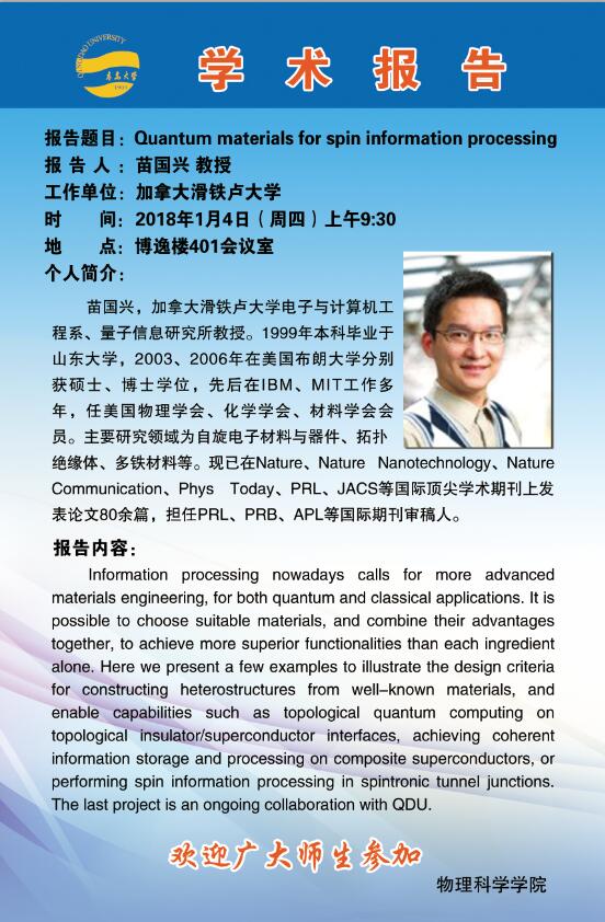 2018物理前沿学术报告第一讲:Quantum materials for spin information processing