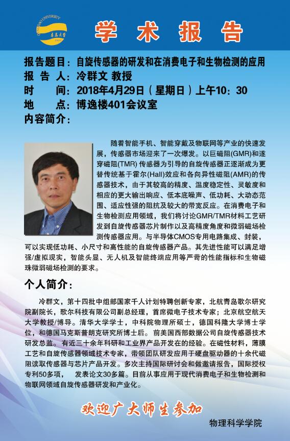 2018物理前沿学术报告第十二讲:自旋传感器的研发和在消费电子和生物检测的应用