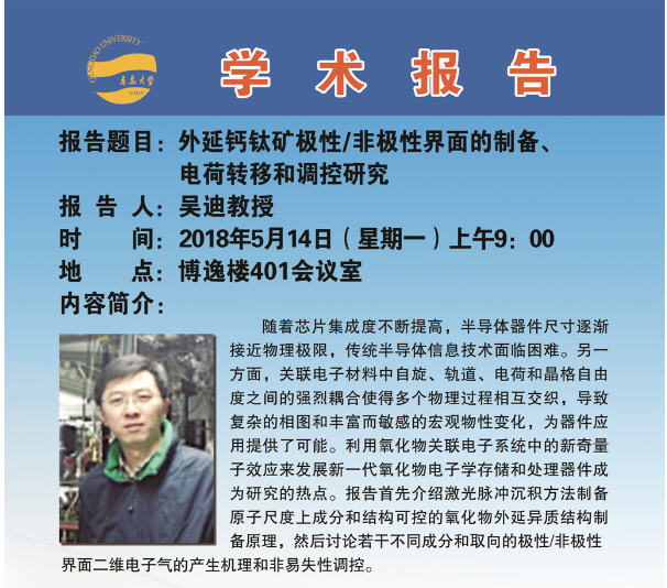 2018物理前沿学术报告第十五讲:外延钙钛矿极/非极性界面的制备、电荷转移和调控研究