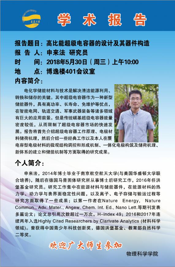 2018物理前沿学术报告第十七讲:高比能超级电容器的设计及其器件构造