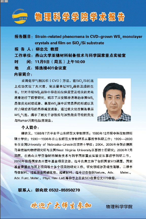 2018物理前沿学术报告第四十四讲:Strain-related phenomena in CVD-grown WS2 monolayer crystals and film on SiO2/Si substrate