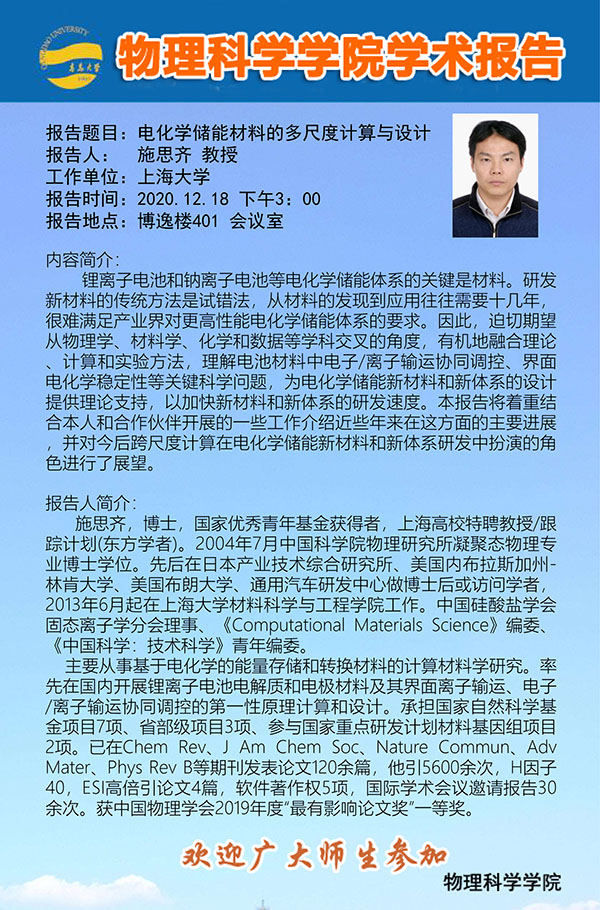 学术报告:电化学储能材料的多尺度计算与设计