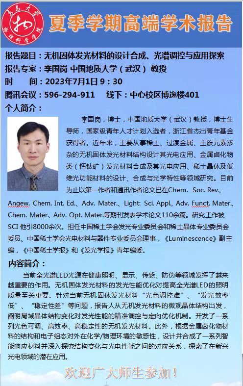 [学术预告]李国岗-无机固体发光材料的设计合成、光谱调控与应用探索