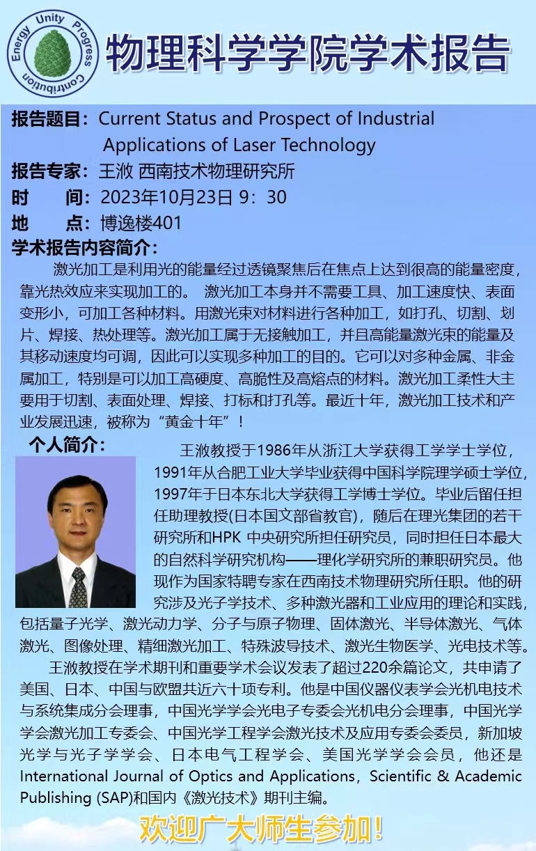 [学术预告]王浟-Current Status and Prospect of Industral Applications of Laser Technology