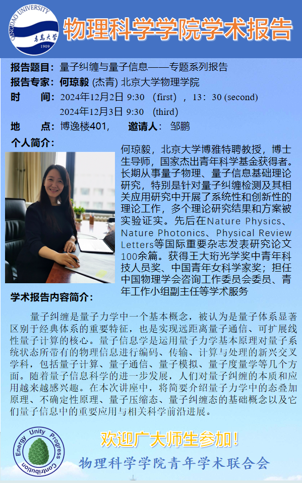 [学术预告]何琼毅-量子纠缠与量子信息