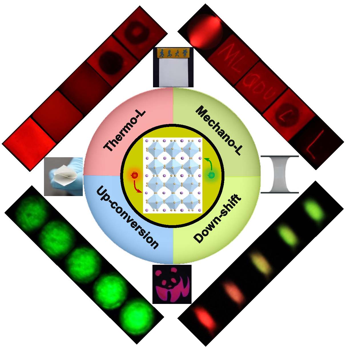 该工作基于晶体场与杂质能级之间的耦合机制,将两种发光离子同时引入压电功能基质,构建受激电子跃迁的多路复用,在单一材料中实现了对热-力-光多重刺激响应的双寿命(延时/非延时)、彩色(红-橙-黄-绿)多模发光,并展示了所开发材料在数据通讯和信息安全领域的应用潜力。该原创性成果为新型多功能发光体的设计开发提供了新的思路,对于推动智能光发射在信息通讯和安全系统的研发和实用进程具有重要意义。