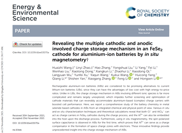 近日,国际顶级期刊《Energy & Environmental Science》在线刊登了我校题为“Revealing the multiple cathodic and anodic involved charge storage mechanism in an FeSe2 cathode for aluminium-ion batteries by in situ magnetometry”的原创性研究论文。《Energy & Environmental Science》是由RSC(Royal Society of Chemistry,英国皇家化学学会)出版发行的全球著名期刊,是国际能源、化学、物理及生物科学等交叉学科领域最具影响力的期刊之一,2021年最新影响因子为38.532。该论文第一作者为青岛大学硕士研究生王怀志、赵林一(导师为李洪森教授)。通讯作者为青岛大学李洪森、李强教授,青岛大学为该论文的第一署名单位和通讯单位。该工作得到了青岛大学大学生创新创业训练计划项目的资助,本科生朱世凯、东晓彤等同学荣获“建行杯”第七届山东省“互联网+”大学生创新创业大赛银奖。