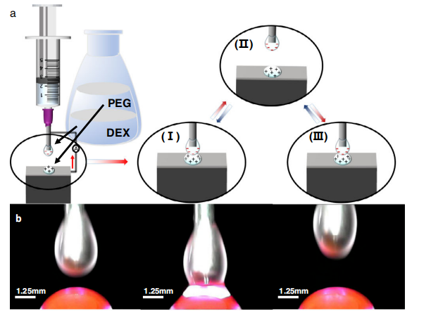 潮湿环境很少存在静电。然而通过配制一定浓度的聚乙二醇(PEG)和葡聚糖(DEX)水溶液,就可以让两滴水溶液不再互相融合而是能够实现接触-分离,而接触分离的同时两水滴也都带了电。