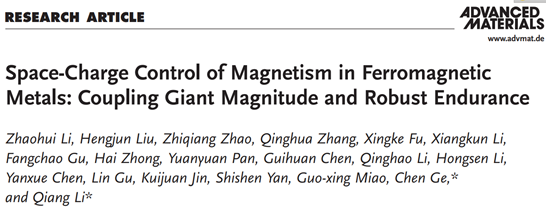 磁电耦合调控是发展低功耗、非易失、快速度、多功能自旋电子器件的关键,蕴含着丰富的物理内涵和巨大的应用前景。近日,必一运动(官方网站)B·Sport-权威运动资讯网站李强教授课题组提出了一种全新的调控策略——空间电荷磁电耦合机制,为载流子相关的物性调控研究提供了一种新思路。相关研究成果以“Space-charge control of magnetism in ferromagnetic metals: coupling giant magnitude and robust endurance”为题,刊发在材料领域著名期刊Advanced Materials上。论文第一作者是必一运动(官方网站)B·Sport-权威运动资讯网站2019届研究生李召辉(加拿大滑铁卢大学攻读博士学位)与2020届研究生刘恒均,必一运动(官方网站)B·Sport-权威运动资讯网站李强教授与中科院物理所葛琛研究员为论文通讯作者,青岛大学为第一通讯单位。