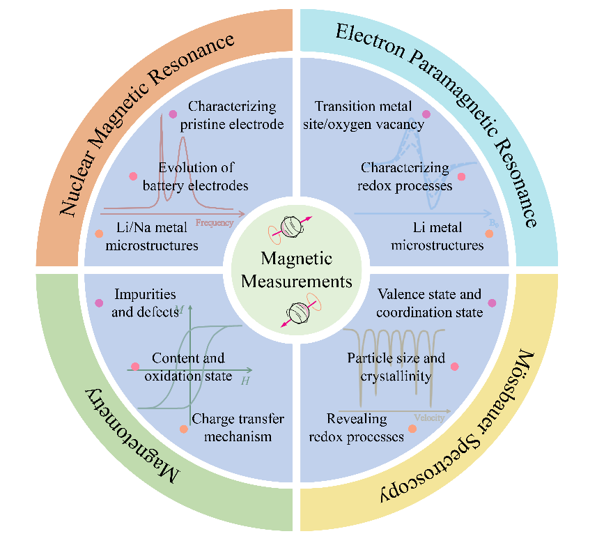 新能源电池充放电过程常伴随着晶格结构和能带结构的物理改变,明确界面过程的基本物理图像,对于优化能源系统性能指标具有重要意义。二次电池发展的瓶颈问题已经深入到了晶格场,电子轨道分布,自旋轨道耦合作用等更深层更复杂的科学领域,超出了单一常规表征手段的分析能力,也超出了单一学科的知识范畴。大量储能电极材料中富含过渡族金属元素,这些含有过渡金属元素的电极材料的晶格结构、电子构型、电化学性质等与磁性密切相关,这为磁性表征电化学过程提供了可能。经过漫长的发展,磁学形成了深厚系统的理论基础以及分析表征手段,既能从原子离子等尺度分析材料的性质和特点,又能从晶体场,晶格结构,耦合作用等角度出发,分析电化学过程材料深层次机理, 具有广阔的应用空间和鲜明的研究优势。该综述全面系统地介绍了磁学测量技术在储能领域中的应用,分析了磁性、电子结构与电化学性能之间的密切联系。最后,对磁电化学测量当前面临的挑战和未来的发展方向进行了讨论展望。