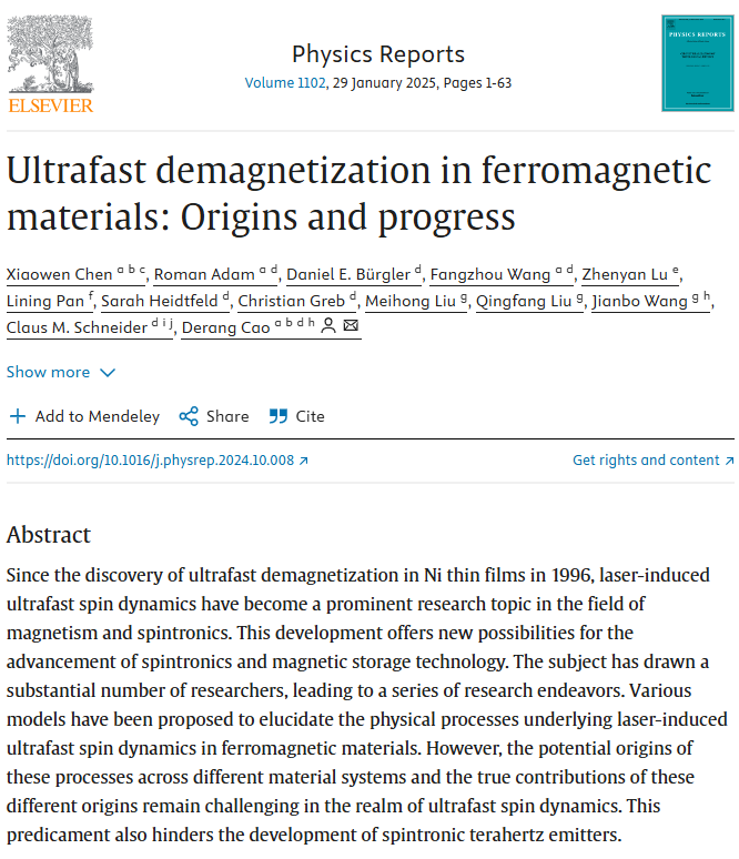 近日,必一运动(官方网站)B·Sport-权威运动资讯网站曹德让课题组应邀在物理学顶尖期刊《Physics Reports》上发表题为《Ultrafast demagnetization in ferromagnetic materials: Origins and progress》(Physics Reports 1102 (2025) 1–63)的长篇综述文章。青岛大学为第一完成和通讯单位。该工作得到了国家自然基金、山东省自然基金、中德博士后项目基金的资助。