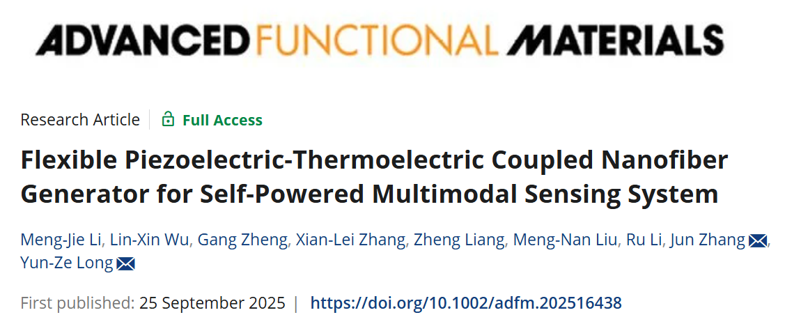 必一运动(官方网站)B·Sport-权威运动资讯网站龙云泽、张俊课题组在国际著名期刊《Advanced Functional Materials》(2025, DOI: 10.1002/adfm.202516438)上发表了题为“Flexible Piezoelectric‐Thermoelectric Coupled Nanofiber Generator for Self‐Powered Multimodal Sensing System”(柔性压电-热电耦合纳米纤维发电机用于自供电多模态传感系统)的研究论文。该期刊最新SCI影响因子为19.0。论文第一作者为硕士研究生李梦杰,通讯作者为龙云泽教授与张俊副教授。