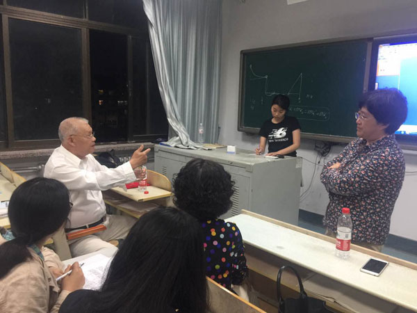 研究生和本科生通过PPT演示了自己的实验设计作品,学院张芳主任、何丽珠主任以及姜静、韩会景老师进行了现场指导,陈祖骥老师认真听取同学们的实验作品汇报,并一一给予指导。老师和同学们共同讨论实验作品的可行性以及如何解决存在的问题,大家热情高涨,整个活动一直持续到晚上10:30。此次展示会主要为即将于7月举行的“山东省第十二届大学生与研究生物理教学技能大赛”作准备。