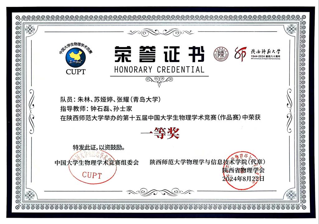 8月18—23日,第十五届中国大学生物理学术竞赛(CUPT)国赛在陕西师范大学胜利举办,来自哈尔滨工业大学、复旦大学、北京大学、山东大学等国内91所高校的92支队伍展开了激烈角逐。由必一运动(官方网站)B·Sport-权威运动资讯网站三位本科生组成的青岛大学代表队,最终在作品赛道荣获一等奖,创造历史最佳成绩,并实现该项赛事在2024年度山东省赛、华东区赛、全国赛的大满贯。