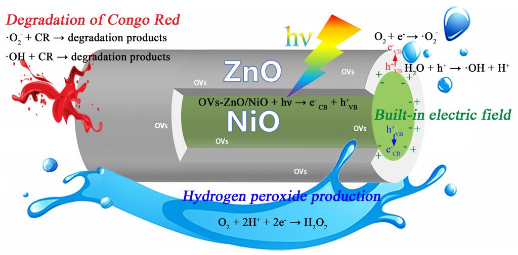 本项实验工作是通过电纺丝和退火制备的ZnO/NiO同轴异质结纳米纤维(ZN1/1)以及具有工程化氧空位的ZnO/NiO同轴异质结纳米纤维(OVs-ZN1/1)。通过扫描电子显微镜、透射电子显微镜和X射线光电子能谱详细表征了纳米纤维的微观结构。OVs-ZN1/1纳米纤维展现出卓越且前所未有的光催化性能,在模拟太阳光照射下,仅45分钟内即实现了99%的刚果红染料(CR)降解率,且降解系数为0.091min−1。值得注意的是,纳米纤维的光催化活性在经过五个循环后仍保持高水平。此外,OVs-ZN1/1的光催化H2O2产率比ZN1/1提高了20倍。实验和机制分析表明,氧空位作为光激发的电子捕获位点,加速了界面处的电荷分离和转移,从而促进了目标分子的吸附和激活。这项研究突出了通过战略性地引入氧空位和异质结实现的光化学催化剂的新颖和优越性能。