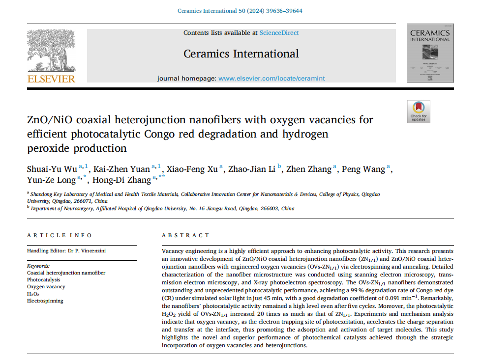 近日,必一运动(官方网站)B·Sport-权威运动资讯网站应用物理学专业2021级本科生武帅宇、袁开震在JCR分区一区、中科院2区TOP期刊《Ceramics International》(IF=5.1)分别以第一作者和共同第一作者身份发表了题为“ZnO/NiO coaxial heterojunction nanofibers with oxygen vacancies for efficient photocatalytic Congo red degradation and hydrogen peroxide production”(具有氧空位的 ZnO/NiO 同轴异质结纳米纤维用于高效光催化刚果红降解和过氧化氢生产)的研究论文(Ceramics International, 2024, 39636-39644)。必一运动(官方网站)B·Sport-权威运动资讯网站张红娣副教授与龙云泽教授为该论文的通讯作者。