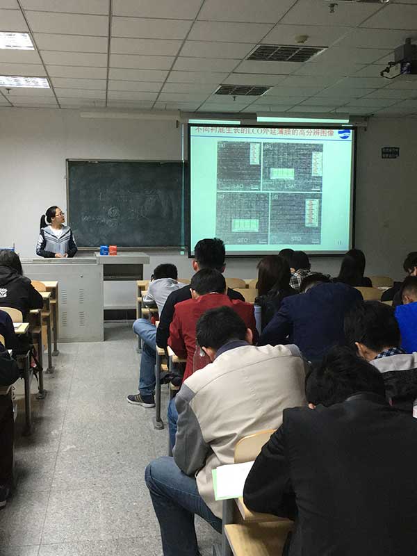 钙钛矿结构的氧化物是一种很重要的绝缘透明材料,它具有高温超导、巨磁阻、铁电、铁磁、多铁性等重要的物理性质。钙钛矿结构的薄膜结构简单,易于掺杂,刘桂菊从横截面透射电镜样品的制备、LaCoO3外延薄膜的微观结构及物理性能研究、SrRuO3外延薄膜的微观结构及生长机理研究三个方面,介绍了她的研究方向和进展,并以LaCoO3薄膜和SrRuO3薄膜为例,详细介绍了钙钛矿型功能氧化物薄膜方面的结构特点和实际应用。报告后,大家积极提问并进行了探讨。