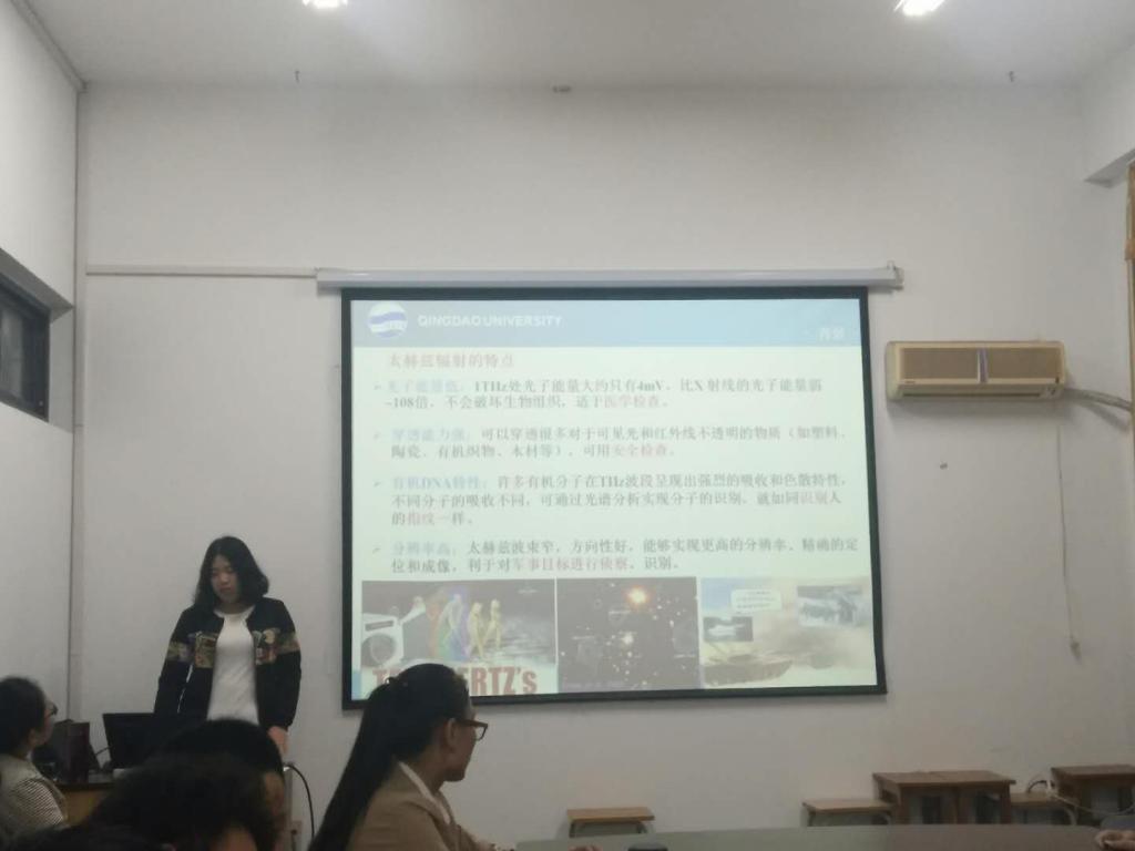 太赫兹辐射具有光子能量低、穿透能力强、有机DNA特性、分辨率高的特点,有机非线性光学晶体DAST(4-N,N-dimethylamino-4′-N′-methyl-stilbazolium tosylate)由于其高电光系数和非线性系数等特性成为光整流法产生检测THz波的一种有重要应用价值的晶体。滕菲详细介绍了有机非线性光学晶体DAST以及DAST衍生物:DSTMS晶体、OH1晶体、PBSB晶体的生长原理和生长过程;最后滕菲又结合自己的研究工作跟大家分享了科研工作需要的各种工具和自己的感悟。报告会后,就相关问题与大家进行了讨论交流。