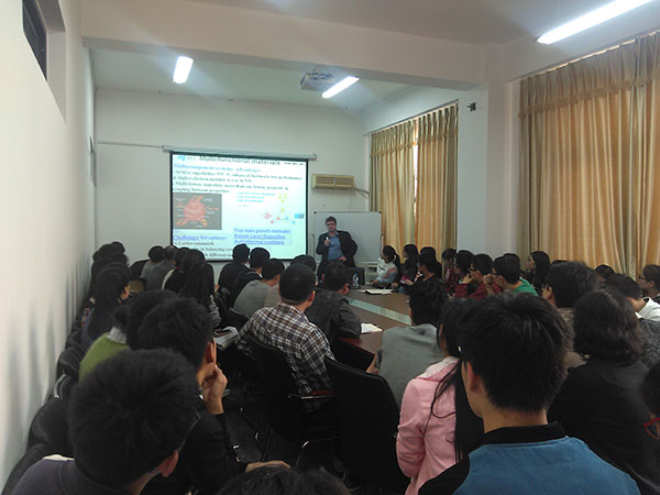 Federico Rosei院士结合自己多年的研究成果,通过翔实的数据和材料,介绍了多功能材料在太阳能技术中的应用。报告指出,化石能源日渐衰竭,人们迫切发展有效的和可持续发展的再生能源技术。研究发现,通过不同的策略来控制纳米结构的组装,设计和合成功能材料,能够帮助人们应对能源危机。Rosei院士课题组制备了多种功能材料,并研究了其结构与性能之间的关系。主要包括:纳米半导体结构的尺寸控制及发光性能;设计新的方法来合成应用于电子学和光伏领域的多功能纳米材料。报告中,Rosei院士与师生进行多次互动交流,起到了较好的启迪效果。