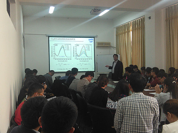 王乙潜教授作了题为《金属氧化物纳米材料在光催化及传感器中的应用》的学术报告。报告首先介绍了金属氧化物纳米材料的应用前景,并对Cu2O、Fe2O3、SnO2等金属氧化物纳米材料的制备、微观结构和物理化学性能进行了系统阐述。王教授还与研究生交流了一些科研的心得体会。他强调,在实验中不要放过一些反常的现象,要对这些现象进行思考和探究,因为许多重要的发现就蕴含在这些现象中。做科研需要坚持,要付出才会有回报。此外,要经常与导师沟通交流,大胆地表达自己的想法,要敢于用实践证明自己的想法。要大道至简,积极探索如何用最简单的方法做出好的科研成果。