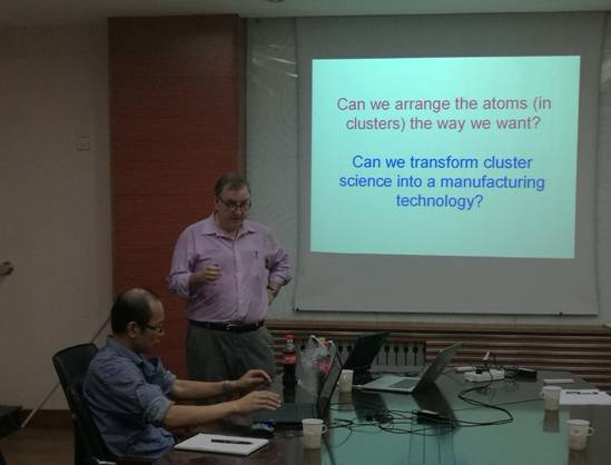 Richard E. Palmer教授在报告中详细介绍了金属团簇尺寸控制的方法、原子构型的探测、金属团簇结构演化规律等方面的研究。报告会后,Palmer教授与必一运动(官方网站)B·Sport-权威运动资讯网站的青年教师和研究生进行了深入交流和讨论,为同学们解答疑惑,并与同学们就出国留学问题进行了座谈。