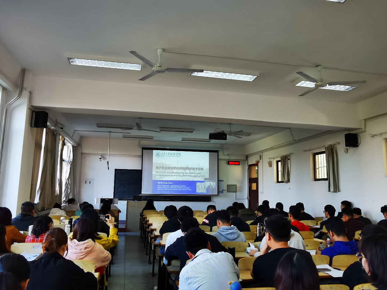 在报告中,陈峰从全反射、光纤和波导结构等基本概念出发,展示了波导结构的优势和相关应用,围绕离子束介绍了晶体和低维材料的改性、波导的飞秒激光直写技术和可选的光子应用器件,详细阐释了离子注入波导、铌酸锂单晶薄膜、嵌入式纳米微粒的合成以及二维材料的缺陷工程等内容。最后,陈峰结合自己的科研学术经历,向师生们分享了自己的感触体会,强调了科研生活具备“国际化视野”的重要性,就不同科研阶段的发展方向提出了建议意见。在提问环节,陈峰与在场的老师和同学就波导的飞秒激光直写技术以及集成光路未来的发展方向等进行了深入讨论,作了详尽解答。