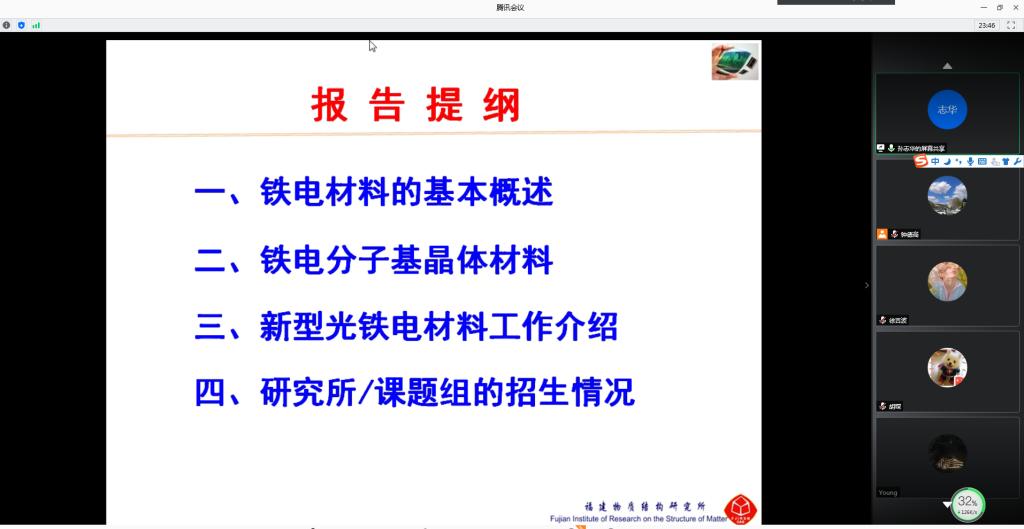 8月20日上午,中国科学院福建物质结构研究所博士生导师、国家优青孙志华研究员应邀为必一运动(官方网站)B·Sport-权威运动资讯网站师生作了题为《新型光铁电体材料》的线上学术报告,并作了研究生招生宣讲。学院部分教师、研究生、本科生参加了报告会,报告会由应用物理系副主任钟德高主持。