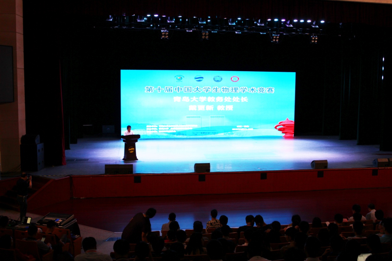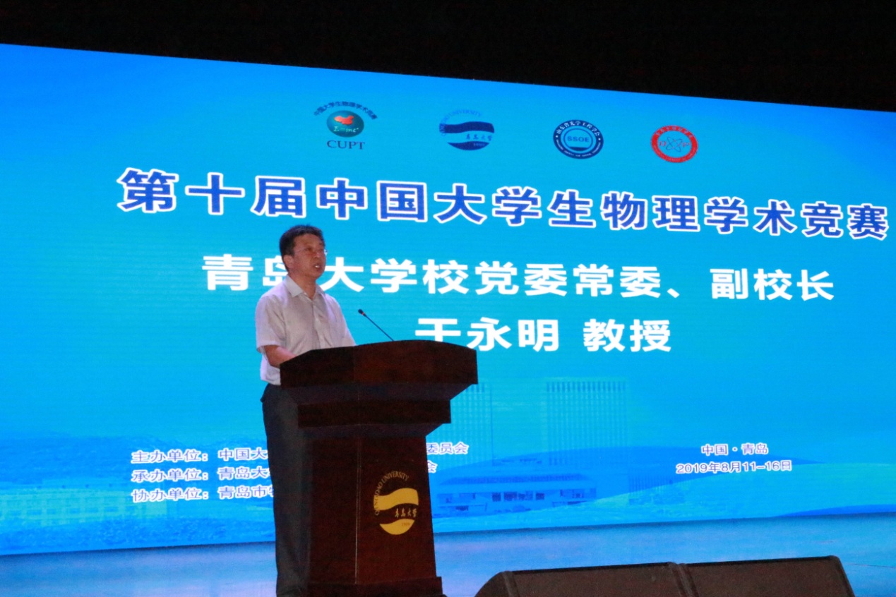 校党委常委、副校长于永明致欢迎辞,他首先对来自全国各地的兄弟院校的师生表示热烈欢迎,随后介绍了青岛大学的办学历史、发展理念和学生科技创新的开展情况。他表示,科技创新水平是国家核心竞争力的重要标志,科技创新对国家经济社会发展的支撑和引领作用日益增强。物理学术大赛对促进全国各高校物理教学的交流与合作,培养和提高物理专业大学生的实践技能、科学素质和创新能力,发现优秀青年物理科技人才,服务于大学生就业创业具有重要的意义。他希望广大青年凝心聚力、刻苦攻关、不断突破,在物理学科上孜孜以求,为实现中华民族伟大复兴中国梦不懈奋斗,在科技创新等方面做出新的重大贡献。