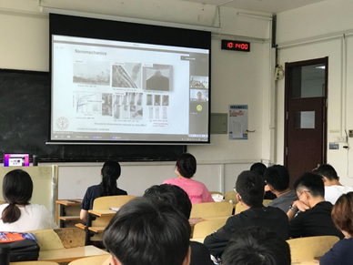 报告会分为学术报告和研招宣讲报告两部分。报告中,张洪题博士首先作了题为《功能材料纳尺度力学性能研究》的报告,介绍了对纳米材料开展力学性能研究的重要意义以及微纳米力学领域内的一些重要研究成果,使同学们对原位纳米力学这一研究方向有了初步的认识和了解。张洪题课题组致力于对晶体材料在纳米尺度所展示出的“结构-性能”间构效关系的研究,以及材料在微纳米尺度由于尺寸效应所引起的机械性能的变化。课题组使用先进的原位电镜分析技术,结合微纳操作转移平台和定制化的微机械器件,在扫描电子显微镜和透射电子显微镜内实现了对单个(根)纳米材料进行原位定量的力学性能测试,同时通过电子显微分析方法对纳米材料的形变机制和失效行为进行研究。在本次讲座中,张洪题博士主要对近几年在探究硅纳米线超大弹性变形、金刚石超大弯曲变形以及金属有机框架作为纳米尺度机械“超材料”等方面的所取得的研究进展进行了报告,并与参会的老师和同学们展开了充分讨论。