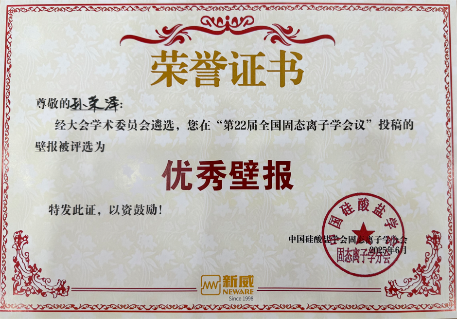 郭向欣教授作为特邀嘉宾出席会议,并作了题为《氧化物聚合物复合固态电解质体系固态锂电池研发进展》的邀请报告。团队赵宁教授受邀作题为《氧化物固体电解质助力全固态电池应用研究》邀请报告,毕志杰副教授受邀作题为《电致变色型固态锂离子电池中的界面调控》邀请报告。报告系统性介绍了郭向欣团队近年来在固态锂电池研究中的基础关键科学问题和在应用方面开展的系列创新工作,进一步提高了我校在能源科学领域的知名度。参加本次研讨会的还有团队中的部分研究生,其中孙荣泽凭借“高比能长寿命锂离子/锂氧气混合电池表界面反应调控及机理研究”荣获优秀墙报奖。