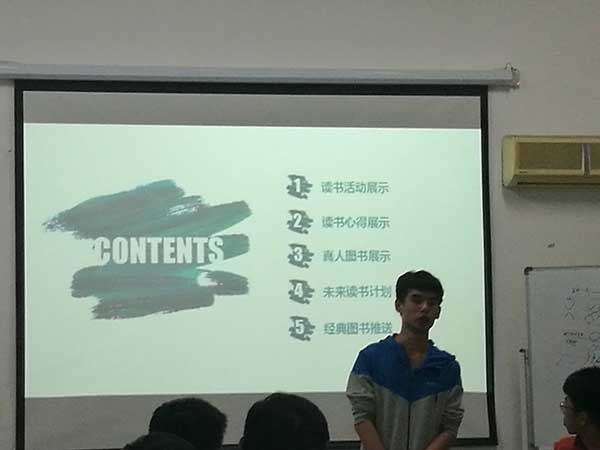 光电信息科学与工程一班特色性开展了班级流动图书库,许桓源同学代表班级同学向大家分享了《人生》、《中国近代史》、《C语言,从入门到精通》等有趣有价值的图书。