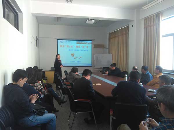 随后滕冰以《聚焦“博士点”,建设“双一流”》为题对学院“十三五”行动计划作了汇报。她首先从科研项目、科研论文、发明专利、平台/团队建设、科研奖励、研究生培养、服务地方、ESI进展、与省内外高校对标等方面总结了物理学科存在的问题不足及应该采取的举措。随后,她从培养条件、考研率/就业率、科技创新/竞赛获奖等方面介绍了学生培养现状,从教学组织体系、教学改革、激励教师投身教学、提升执教能力、完善教学质量监控体系和工作机制、教学资源等方面提出了专业建设的内容和举措,从分类分层次培养满足学生个性化需求、加强实践环节两个方面对教学改革提出了具体要求,从考研率、就业率、学生获奖、出国深造比例、省部级教改立项、专业认证、教学成果奖、国家级视频公开课、国际合作中心等九个方面提出了专业建设的具体目标。最后,她从青年教师培养、师资队伍发展目标等方面提出了队伍建设的目标举措,从科学研究、研究生培养、服务地方等方面提出了学科建设的目标举措,从研究生和教师两个层面提出了制度建设的目标举措。她希望大家积极行动起来,为学院一流专业和一流学科建设出谋划策,使学院“十三五”更好更快发展。