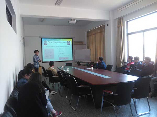 虞祥龙在报告中首先用两个视频向大家介绍了外尔费米子这一“幽灵粒子”的发现过程、主要性质及其应用前景,随后详细介绍了如何利用第一性原理结合KP理论研究掺杂Te对外尔半金属HgCr2Se4的拓扑性质的影响。报告结束后,虞祥龙还与师生就报告和科研等方面的问题进行了深入交流与研讨。