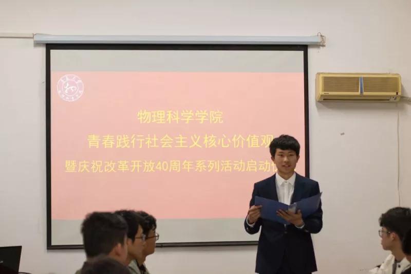 青春践行社会主义核心价值观暨庆祝改革开放40周年系列活动启动仪式,424日在博逸楼401会议室举行。活动由2016级王绪铎同学主持,2016级石书丞同学宣讲。