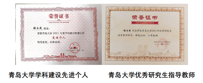 甘于奉献、勇于担当、以高质量工作助力学院一流建设。工作15年来,任院长助理/副院长8年,主要负责学科建设、科学研究和研究生培养等工作。本人先后负责博士点申报(2017),第八届山东省教学成果奖申报(2017)、物理学硕士学位授权点合格评估总结报告(2017)、博士科研流动站申报(2019,2023)、第五学科评估(2020)、第九届山东省教学成果奖申报(2021)物理学博士学位授权点合格评估(2023)等工作。作为骨干人员参与组织学院举办/承办学术会议10余次,参与山东省十二五重点学科申报(2011)、山东省十二五高校重点实验室申报(2011)、山东省特色名校申报-应用物理学重点专业(2012)、国家级实验教学示范中心申报(2013),第四轮学科评估(2016)山东省协同创新中心申报(2018)、学院十四五发展规划(2021)、山东省高校重点实验室申报(2022)、山东省重点实验室申报(2024)等工作。2018年获批物理学一级学科博士点,2023年获批博士后科研流动站,2025年物理学科进入ESI全球排名前1%,凝聚态物理位列U.S.News世界大学学科排行榜第52位。博士点和博士后流动站的获批以及ESI进入全球排名前1%这几项工作均是物理学科建设40多年来的最具标志性的突破。因此,本人多次获评青岛大学学科建设工作先进个人、青岛大学优秀共产党员等称号。