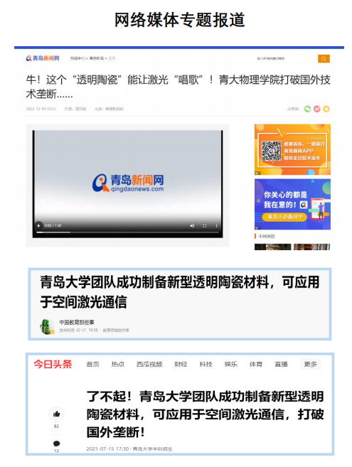 甘做冷板凳、勇啃硬骨头、十年磨一剑、攻克重大技术难题。透明电光材料是光通信器件的核心,也是制约我国光通信技术发展的卡脖子问题之一。美国已率先实现了高性能透明电光陶瓷的制备及器件研发,而国内一直未能突破。面对课题组前期研究基础薄弱、核心设备缺乏,测试设备不完善等困难,本人迎难而上,历时16年,先后自主研发透明陶瓷烧结热压炉,攻克粉体制备、坯体成型和陶瓷烧结等核心关键技术,成功制备出接近理论极限透光率的高性能透明电光陶瓷,并实现了自由空间光通信和血管壁的高频超声成像。被青岛电视台、搜狐、今日头条等多家媒体报道,并于华为等公司合作开展器件研发工作,相关成果获山东省自然科学二等奖。获批国家自然科学基金面上项目、广西重点研发计划子课题、山东省自然学科基金等10余项,发表高水平SCI论文50余篇,授权发明专利4项,逐渐形成了自己的特色,获得国内同行的认可,多次受邀参加学术会议并作邀请报告。基于该成果指导学生竞赛获奖全国大学生光电设计大赛二等奖2项、山东省互联网+、挑战杯省赛金奖2项,科技创新大赛、中国(青岛)国际精英创业创新大赛等奖项20余项。获评山东省创新创业大赛优秀指导教师、青岛大学科技创新大赛金牌指导教师,连续两年获评青岛大学优秀研究生指导教师称号。